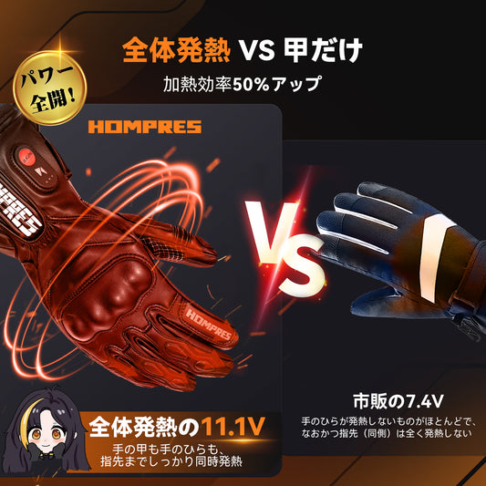 Hompres 2025年 電熱グローブ 全体PU革電熱グローブ 11.1V両面全体発熱 手のひらと同面の指先発熱 残量表示 シガー電源ケーブル付き インナーグローブ付き モデルB